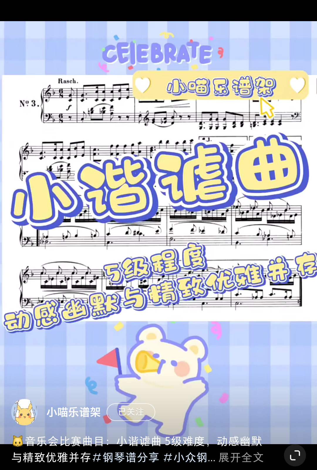 Home / 音乐风格 / 古典 / 5级可爱动感古典音乐会比赛《小谐谑曲舒曼》5.8 5级可爱动感古典音乐会比赛《小谐谑曲舒曼》5.8 动感幽默与精致优雅并存 [audio mp3="/media/uploads/2022/03/小谐谑曲舒曼.mp3"][/audio] 乐谱咨询点击页面上方:联系我们/media/uploads/2022/03/小谐谑曲舒曼.mp3 用户评价 (0) 评价 目前还没有评价 成为第一个“5级可爱动感古典音乐会比赛《小谐谑曲舒曼》5.8” 的评价者 取消回复您的评级 * 评价… 完美 很好 普通 还行 很差 您的评价 *姓名 * 邮箱 * 保存我的姓名、电子邮件和网站,以便下次评论时使用。