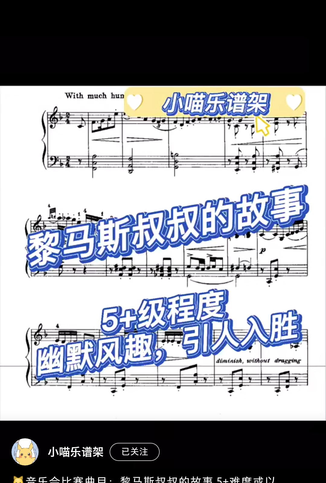 Home / 音乐风格 / 动感 / 5级可爱动感音乐会比赛曲目《黎马斯叔叔的故事》5.8 5级可爱动感音乐会比赛曲目《黎马斯叔叔的故事》5.8 风趣幽默 [audio mp3="/media/uploads/2022/03/黎马斯叔叔的故事.mp3"][/audio] 乐谱咨询点击页面上方:联系我们/media/uploads/2022/03/黎马斯叔叔的故事.mp3 用户评价 (0) 评价 目前还没有评价 成为第一个“5级可爱动感音乐会比赛曲目《黎马斯叔叔的故事》5.8” 的评价者 取消回复您的评级 * 评价… 完美 很好 普通 还行 很差 您的评价 *姓名 * 邮箱 * 保存我的姓名、电子邮件和网站,以便下次评论时使用。